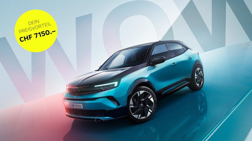 Sondermodell: Mokka Electric Sondermodell GS, Automatik-Elektrogetriebe mit fester Getriebeübersetzung, 100 kW (156 PS). Inkl. Sonderausstattungen (ReNewKnit CHF 700.-, Techno Pack CHF 2900.-,Infotainment Pack CHF 550.- und Aussenfarbe Metallic CHF 900.-). Barkaufpreis: CHF 35'590.- (Fahrzeugwert: CHF 42'290.- abzüglich Preisvorteil CHF 6'700.-). Stromverbrauch: 14.2-16.7 kWh/100km, (Benzinäquivalent: 1,56-1,84 l/100 km), CO2-Emission: 0 g/km, Energieeffizienz-Kategorie: A-B. Leasingbeispiel: Laufzeit: 36 Monate, Laufleistung: 10'000 km/Jahr, Jahreszins nominal 3.99%, effektiv 4.13%. Sonderzahlung: CHF 8875.-, Leasingrate pro Monat inkl. MwSt.: CHF 369.-, Rücknahmewert: CHF 16016.-. Obligatorische Vollkaskoversicherung nicht inbegriffen. Leasingkonditionen unter Vorbehalt der Akzeptanz durch Santander Consumer Finance Schweiz AG, Schlieren. Der Abschluss eines Leasingvertrags ist unzulässig, sofern er zur Überschuldung des Leasingnehmers führt.